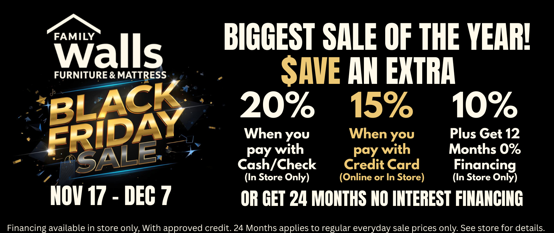 At Walls Furniture & Mattress, we treat every customer like family. Since 1996, we've been offering quality, mid-priced furniture that brings comfort, style, & value into your home. Visit us & experience the warmth of shopping with a locally owned business that cares.