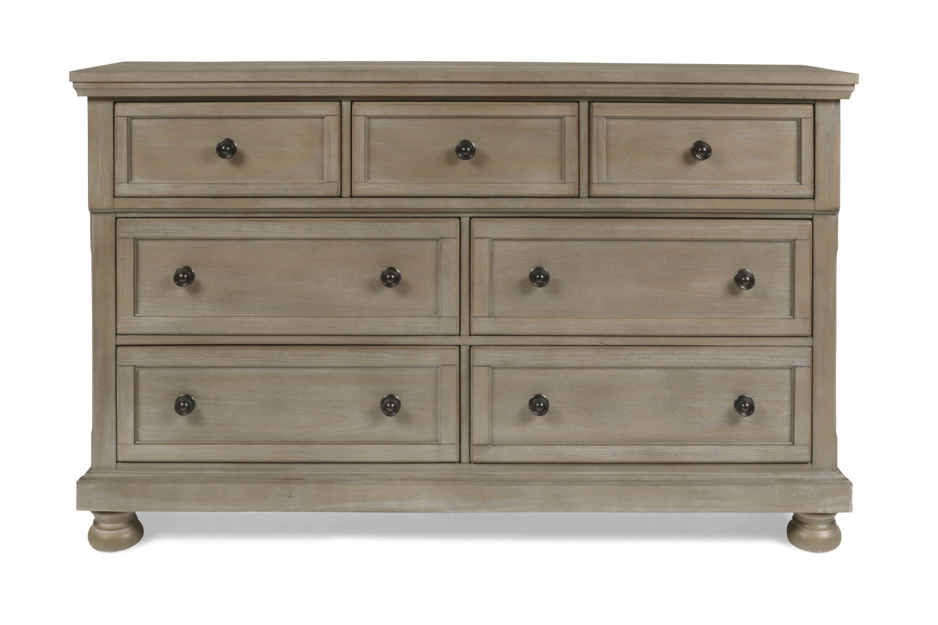 The Allegra 7 Drawer Dresser in a sophisticated pale pewter finish combines durability, style, and thoughtful storage solutions, making it an essential addition to any bedroom. Expertly crafted from solid Mindi wood, engineered woods, and wood veneers, this dresser not only showcases the natural beauty of Mindi's rich grain but also ensures long-lasting durability and resistance to decay. The meticulous multi-step finish, highlighted by a delicate brush treatment and subtle white hang-up effect, adds depth and character to the design, making it a timeless piece that complements both traditional and contemporary interiors. With its clean lines and subtle curves, the Allegra dresser embodies transitional elegance, blending classic and modern elements seamlessly. Built with heirloom craftsmanship, the dresser features four-corner English dovetail joints for exceptional strength, smooth-rolling full-extension glides for easy access, and fully finished interiors to protect your clothing. The dresser also includes felt-lined top drawers for delicate items and cedar-lined bottom drawers to preserve freshness, while hidden storage compartments add an extra layer of security for your most valued belongings. The Allegra 7 Drawer Dresser is a perfect blend of style, quality, and functionality, designed to elevate your bedroom space.