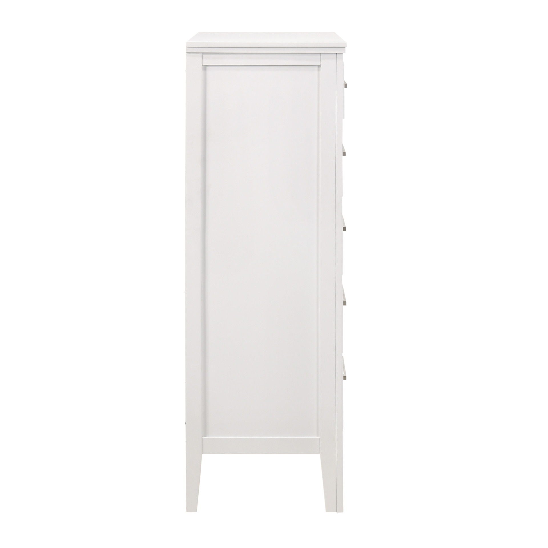 The Andover Five Drawer Wood Chest combines durability, functionality, and modern rustic style, making it an essential piece for any bedroom. Expertly crafted from solid Rubberwood, manufactured woods, and wood veneers, this chest is built to last while highlighting the natural beauty of real wood. The rich finish is the result of a meticulous multi-step process that includes sand-throughs and white glazing, imparting a weathered yet refined appeal that enhances the wood's natural grains and unique characteristics. The Andover chest’s clean lines and cohesive design are complemented by sleek, elongated metallic handles that add a sophisticated contrast to the dark wood finish. Framed drawer fronts add depth and dimension, while the sturdy block-style legs ensure a solid foundation that underscores the chest's robust and enduring structure. The drawers glide smoothly on Kenlin drawer glides, ensuring reliable operation, and feature dovetail joinery, reflecting superior craftsmanship and lasting quality. This chest offers ample storage space while enhancing your bedroom's aesthetic with its timeless and versatile design.
