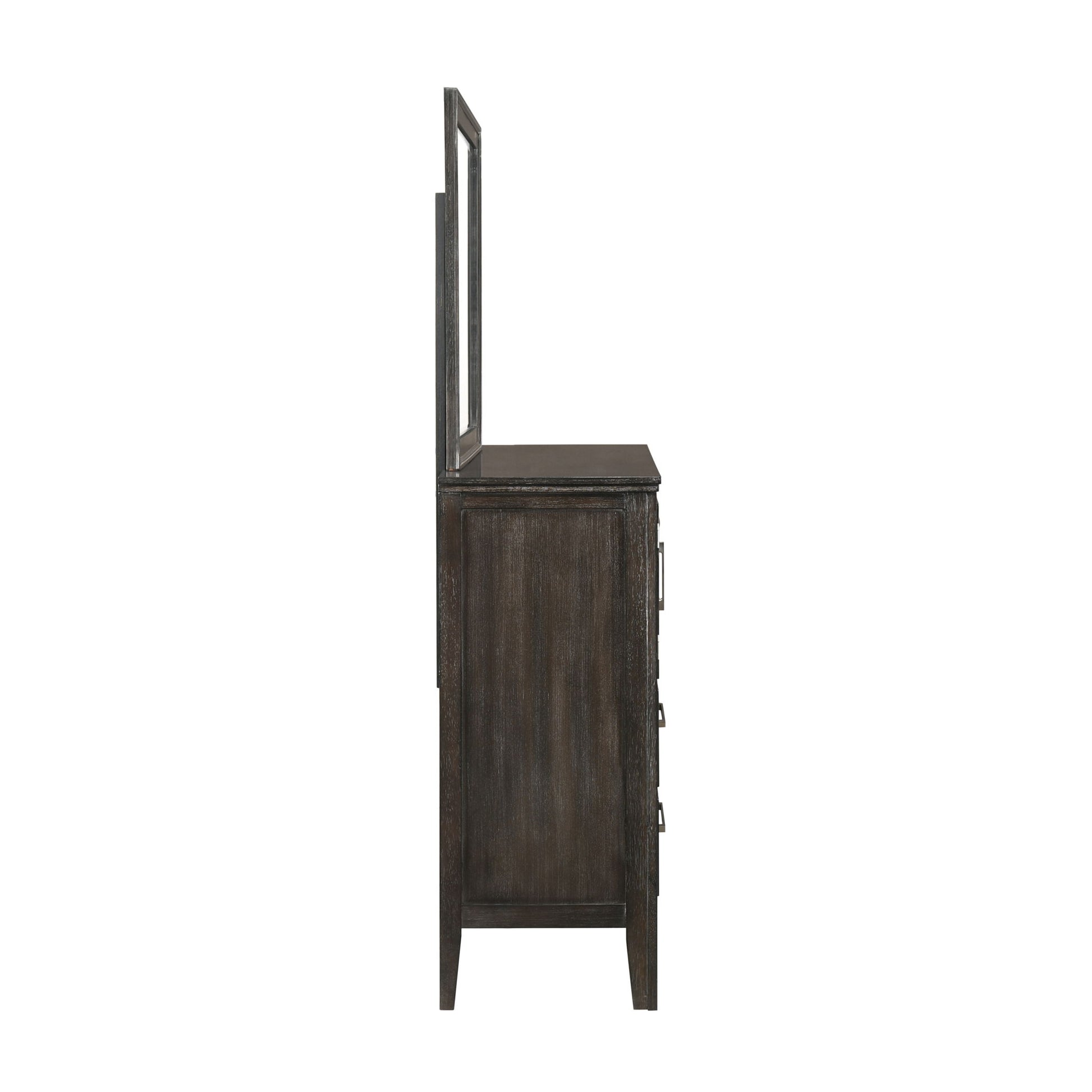 The Andover 2-Piece Wood Dresser and Mirror Set offers a blend of durability, style, and functionality, making it an ideal addition to any bedroom. This set includes a dresser and a matching mirror, both expertly crafted from solid Rubberwood, manufactured woods, and wood veneers, ensuring long-lasting durability while showcasing the natural beauty of real wood. The rich Nutmeg Brown finish is achieved through a meticulous multi-step process, featuring sand-throughs and white glazing, which imparts a sophisticated, weathered appeal, highlighting the unique grains and characteristics of the wood. The Andover collection’s clean lines and modern rustic style are complemented by sleek, elongated metallic handles that provide a sophisticated contrast to the warm, dark wood finish. The framed drawer fronts add depth and dimension, while the sturdy block-style legs ensure a solid and stable foundation. The drawers glide smoothly on robust Kenlin drawer glides and feature dovetail joinery, a testament to superior craftsmanship. The set is completed by the pristine, low-distortion beveled glass mirror, encased in picture frame-style moldings that offer a clean, elegant look, enhancing any space with timeless sophistication.