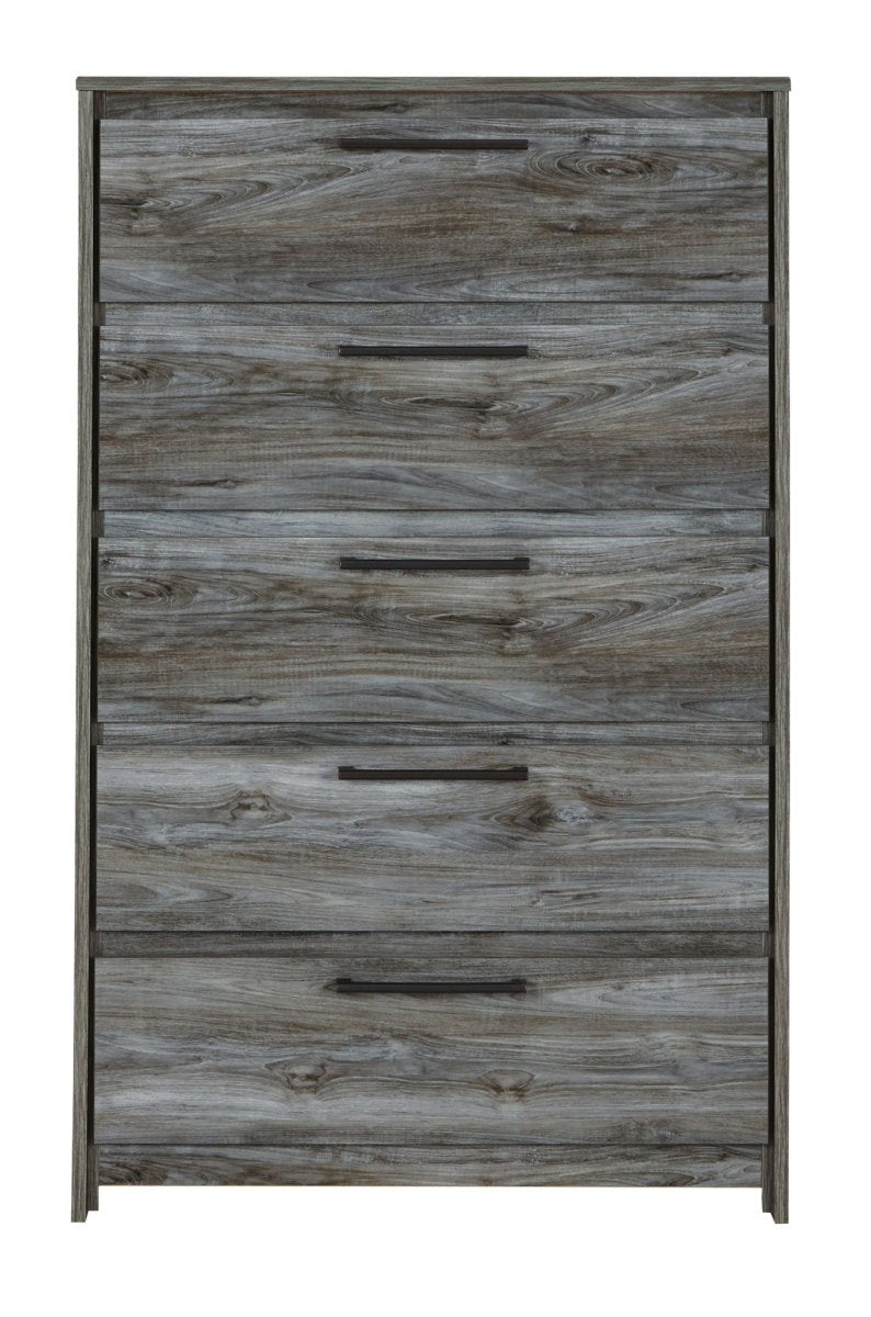 Casually cool style and lots of storage go hand in hand with this chest of drawers. A weathered finish over replicated oak grain creates an easygoing vibe, setting the scene in your restful retreat. Clean lines and modern handles provide a fuss-free look. And the chest's five roomy drawers give you plenty of space for stowing away clothes and more.