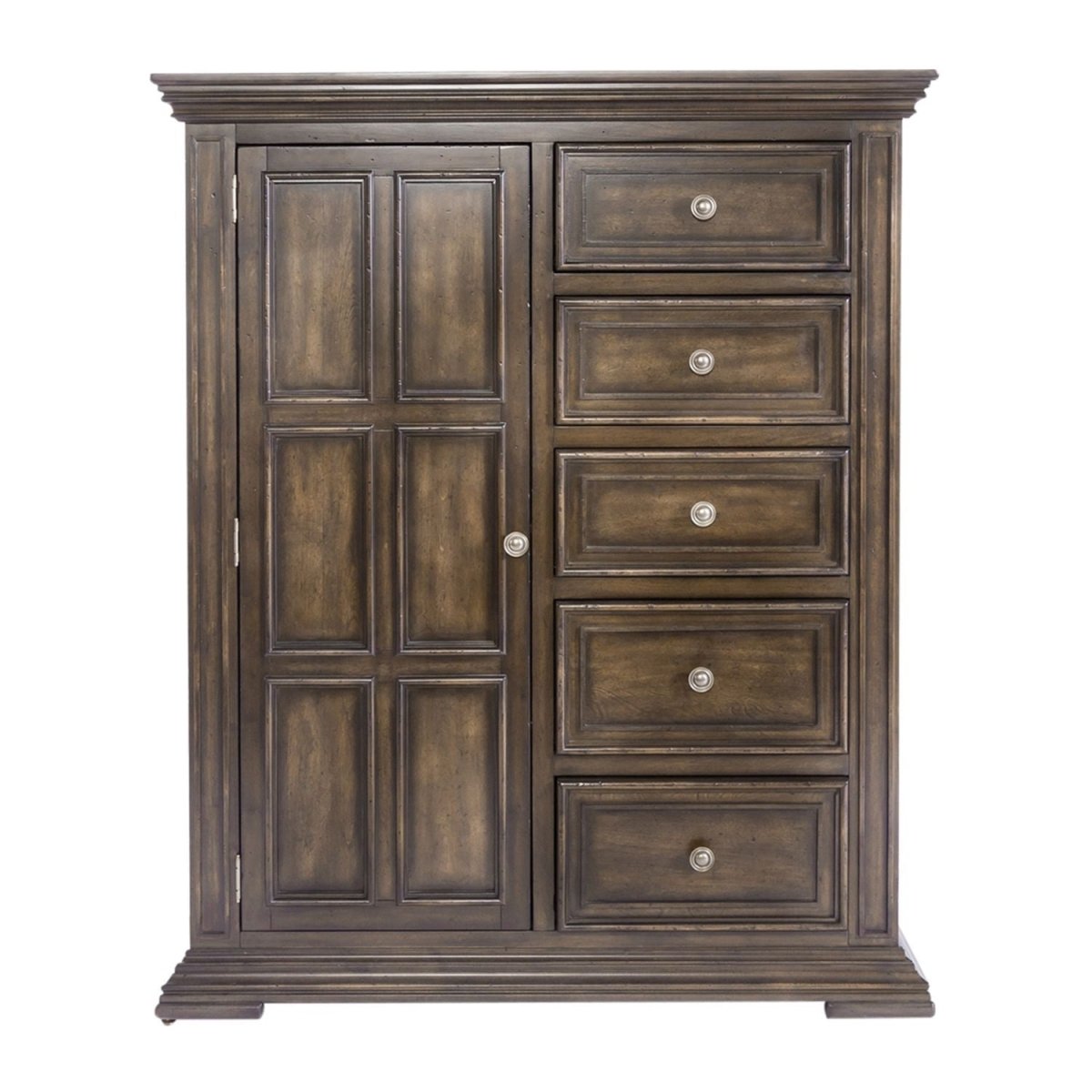 Combined todays modern lifestyle and traditional past with the Big Valley door chest. Crafted with rubberwood solids and wood products, this piece features 5 drawers and 1 door, bottom case dust proofing and fully stained interior drawers. The door opens to reveal 3 adjustable shelves, perfect for user customization.