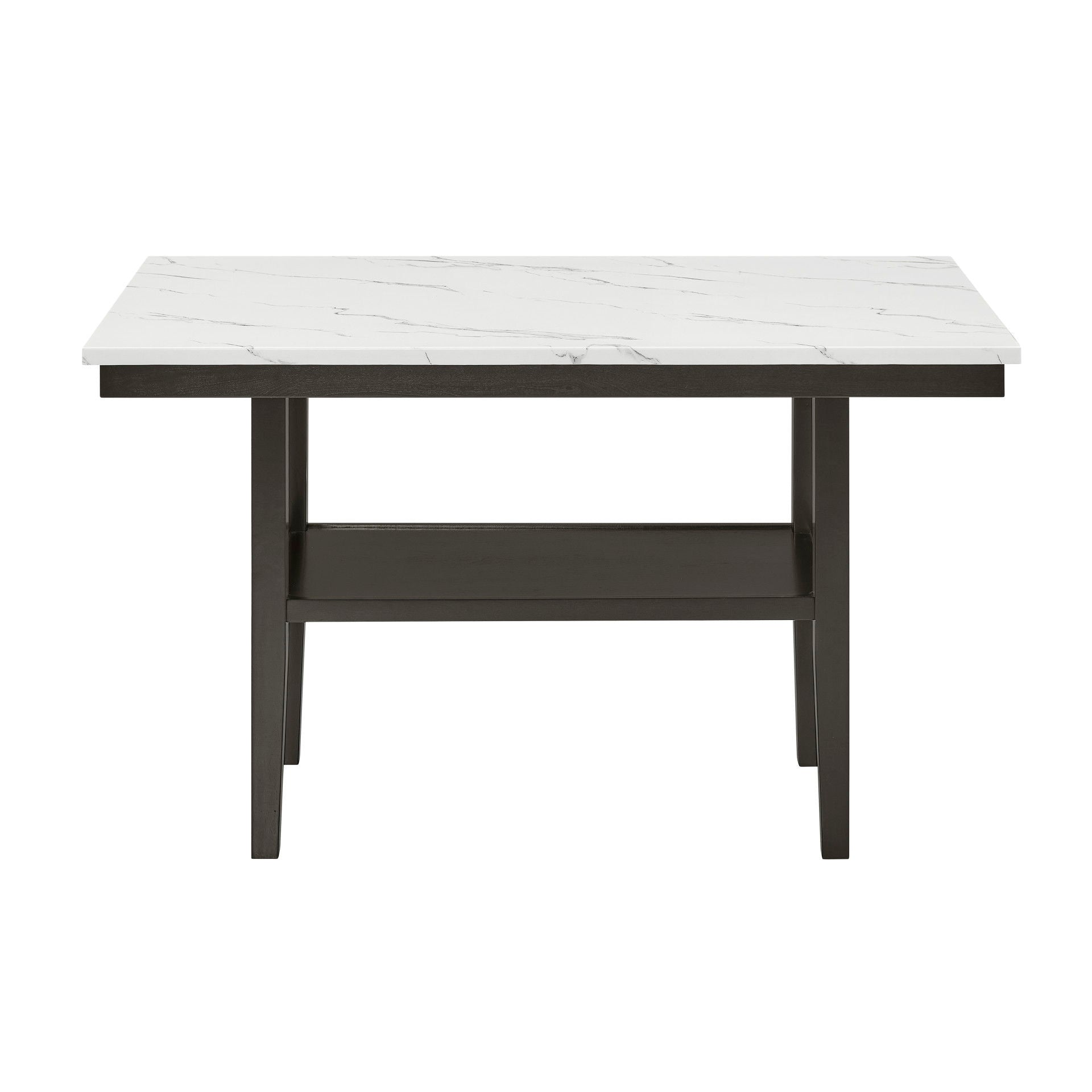 The Carissa 60" Rectangle Counter Table with Storage Shelf blends modern style and smart functionality. Crafted with durable Rubberwood legs and engineered wood, it features a glossy faux marble top that’s heat- and water-resistant for everyday durability. A lower shelf offers extra storage, while the sleek white and gray veining paired with deep espresso legs creates a chic, contemporary look for your dining space.