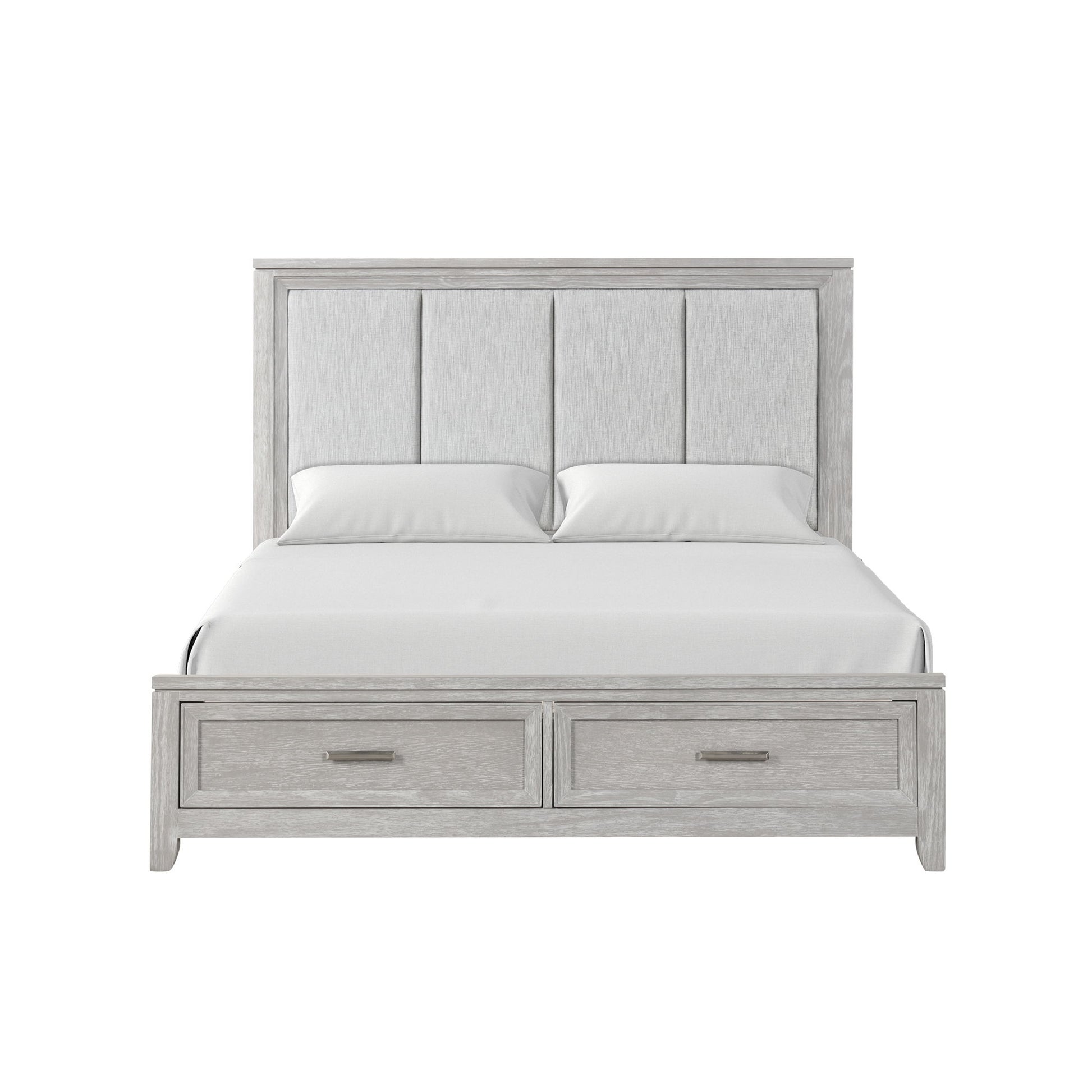 The Fiona Storage Bed is a testament to craftsmanship and design. Constructed with Acacia solids, manufactured woods, and oak veneer, this bed is a harmonious blend of strength and the natural allure of wood. The wood grain comes to life under a multi-step finish, featuring wire brushing and white glazing, culminating in a mist gray hue that complements any room. Classic elements like picture frame moldings and tapered legs are paired with modern drawer pulls to create a timeless piece. Its transitional style seamlessly adapts to both traditional and contemporary spaces. For comfort that doesn’t compromise on luxury, the headboard is upholstered in soft, 100% polyester fabric, offering support for bedtime reading. The footboard integrates two spacious drawers, providing a clever storage solution for blankets and linens, optimizing your space with elegance and efficiency.