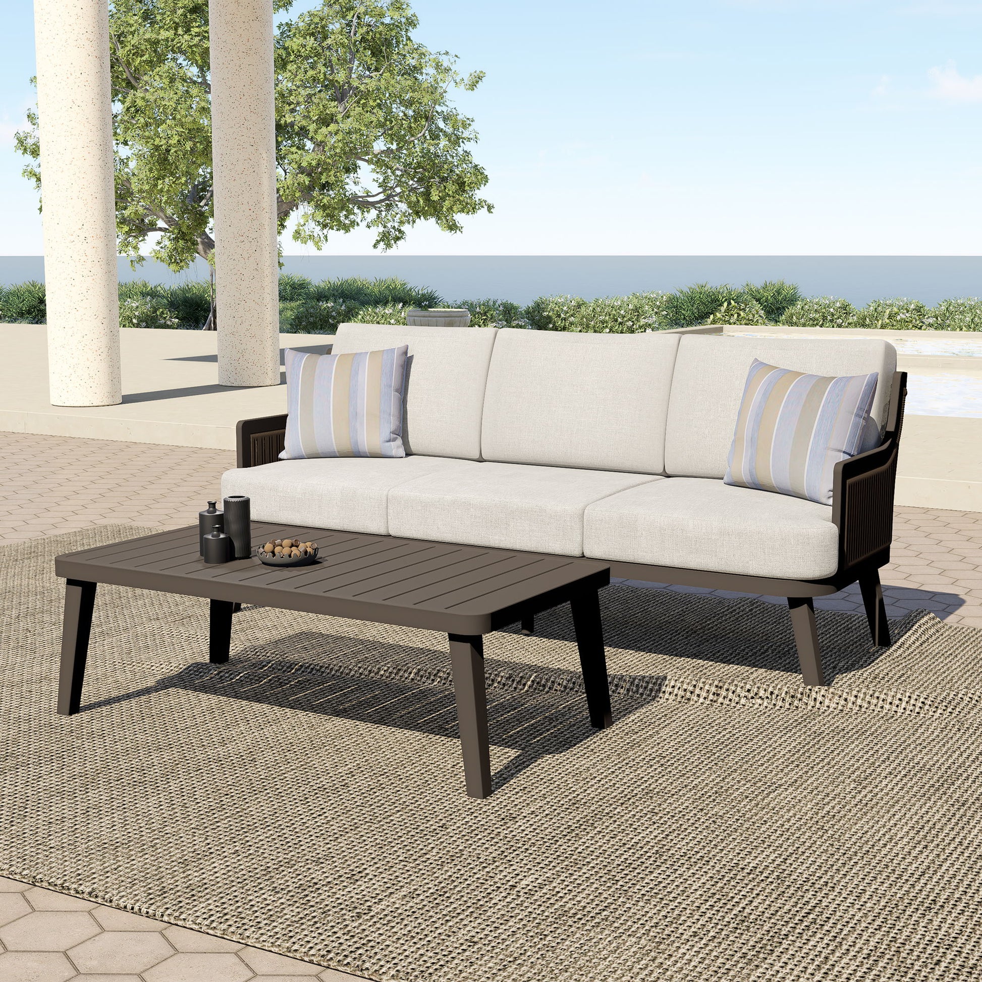 The Genova Patio Set, featuring a spacious patio sofa and a stylish coffee table, effortlessly combines durability, comfort, and modern sophistication for any outdoor space. Built with durable aluminum frames and a baked-on powder coat finish, this set offers superior scratch resistance and long-lasting performance. Designed for all-weather durability, the furniture is wrapped in high-density PE wicker, an eco-friendly synthetic resin that provides the classic look of wicker with the added benefits of being low-maintenance, colorfast, and resistant to water, mildew, and fading. The sofa features plush 6 ½" high-density foam seat and back cushions upholstered in premium light gray Sundura™ fabric—a solution-dyed 100% polyester that resists fading, mildew, and moisture, ensuring vibrant color and lasting protection season after season. The coffee table’s slatted top adds a classic touch while promoting water drainage for added practicality. Designed with clean lines, neutral tones, and a woven rope seat back, this set delivers an open, airy feel with solid structural support. The minimalist design is enhanced by evenly spaced vertical strands, bringing a refined texture and contemporary elegance to any outdoor setting.