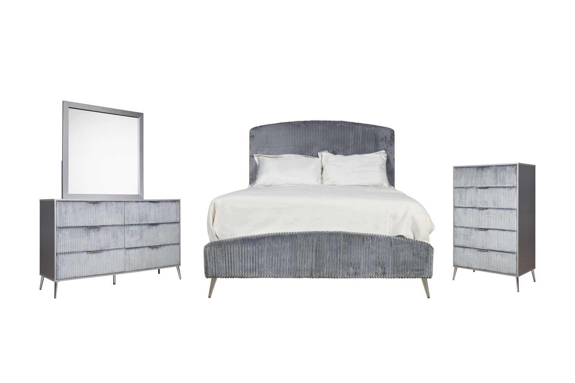 The Kailani Bedroom Set is a masterful combination of modern design, luxurious comfort, and sustainable craftsmanship, perfect for creating a sophisticated and inviting bedroom space. This set includes an upholstered panel bed, dresser, mirror, chest, and two nightstands, all expertly crafted from a durable blend of solid rubberwood, engineered wood, and eco-friendly decorative laminate. The construction ensures long-lasting beauty with superior resistance to scratches, moisture, and stains, making maintenance a breeze. The modern minimalist design features clean lines, a sleek silhouette, and chic ribbed textures, complemented by slim metallic handles and tapered legs that enhance the contemporary aesthetic. The bed, wrapped in plush 100% Polyester Velvet, exudes warmth and sophistication, with a generously padded headboard ideal for relaxation. The matching furniture, with its textured drawers highlighted by gleaming gold pulls and angled legs, adds a touch of glamour to the set, making it a standout in any bedroom. The spacious drawers are designed for seamless functionality, featuring fully finished interiors, full-extension slides, and durable dovetail joinery for smooth, snag-free storage and lasting strength. With easy assembly, requiring just 60 minutes to set up the bed and secure the casegood legs and drawer pulls, the Kailani Bedroom Set offers both style and convenience, making it a perfect addition to any modern home.