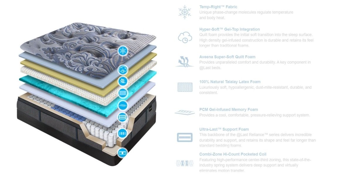 The surface begins with Temp-Right™ Fabric, featuring phase-change molecules that regulate body heat and keep you at the perfect temperature through the night. A layer of Hyper-Soft™ Gel-Top quilting foam provides a cool, plush transition into the mattress, paired with Aveena Super-Soft Quilt Foam for long-lasting softness and resilience.