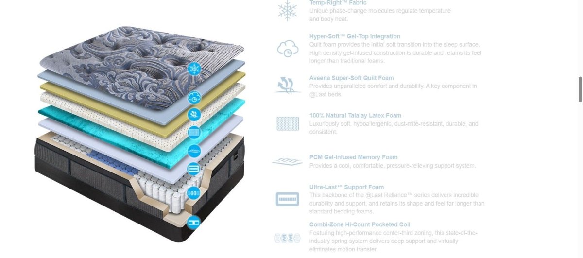 The surface begins with Temp-Right™ Fabric, featuring phase-change molecules that regulate body heat and keep you at the perfect temperature through the night. A layer of Hyper-Soft™ Gel-Top quilting foam provides a cool, plush transition into the mattress, paired with Aveena Super-Soft Quilt Foam for long-lasting softness and resilience.