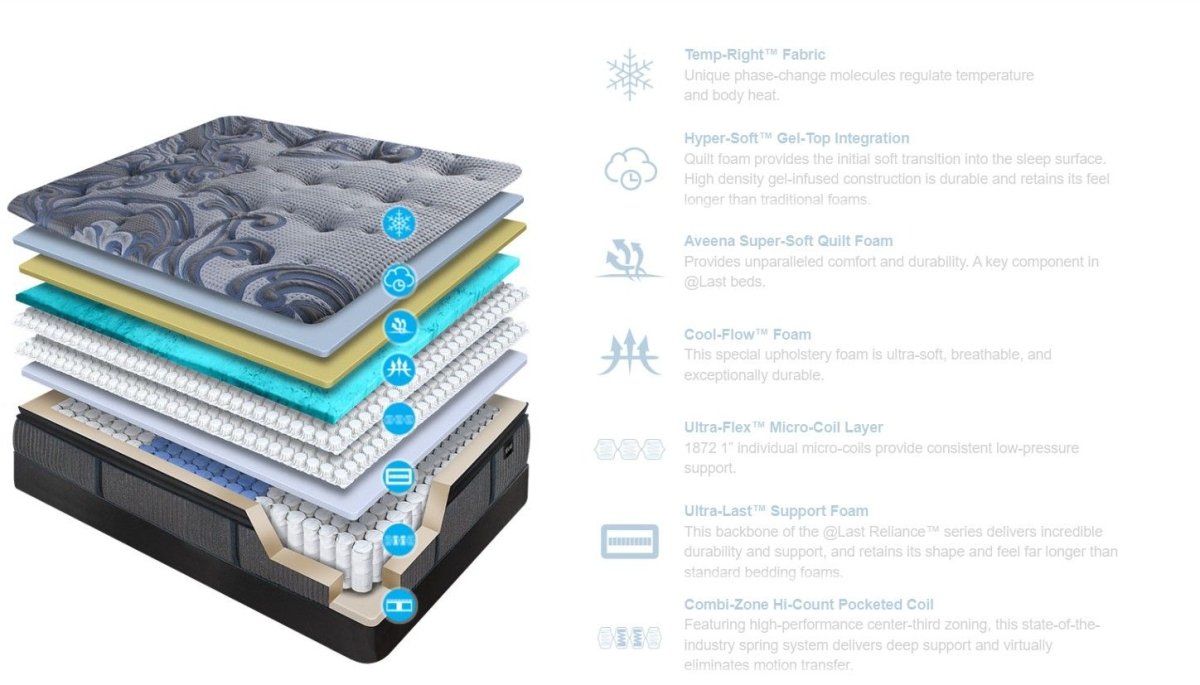 For deeper support, Ultra-Flex™ Micro-Coils (1,872 individually wrapped coils) provide precise pressure relief and contouring, while the Ultra-Last™ Support Foam ensures long-term durability and structure. The advanced Combi-Zone Hi-Count Pocketed Coil System offers targeted center-third support to promote healthy spinal alignment and reduce motion transfer. All of this is built on the Ever-Last™ Foundation, a 17-slat upholstered wood base designed for lifetime stability.