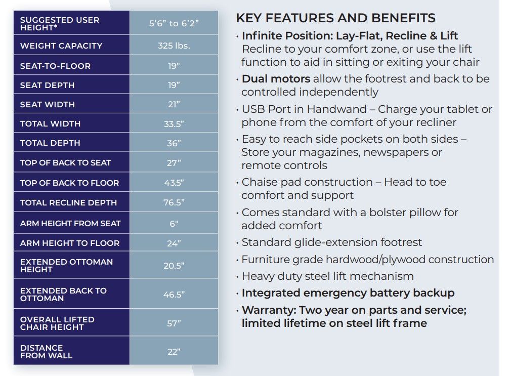 Built with furniture-grade hardwood/plywood, a heavy-duty steel lift mechanism, and an integrated emergency battery backup, this chair is made for long-term dependability.