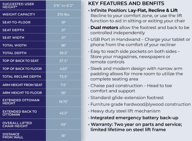 With dual motors, the back and chaise recline independently, giving you full control to find your perfect position. Recline to watch TV, lay flat for a nap, or use the lift function for safe assistance when sitting or standing.