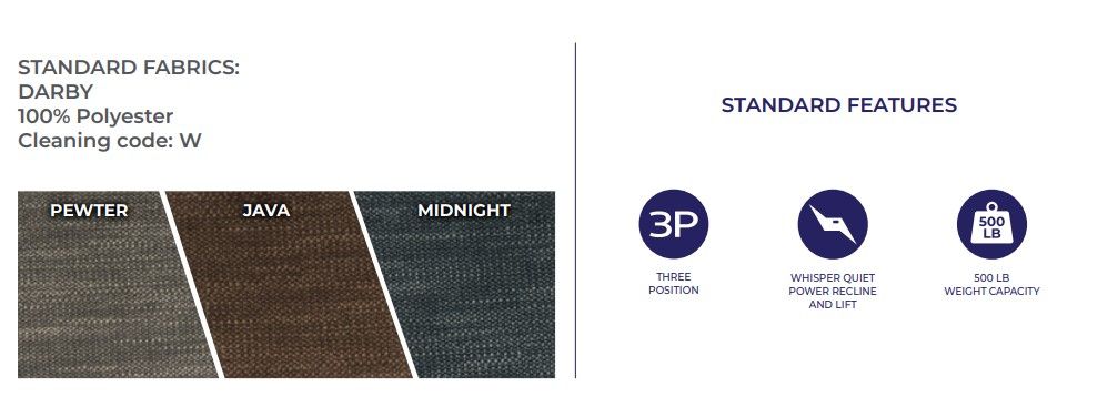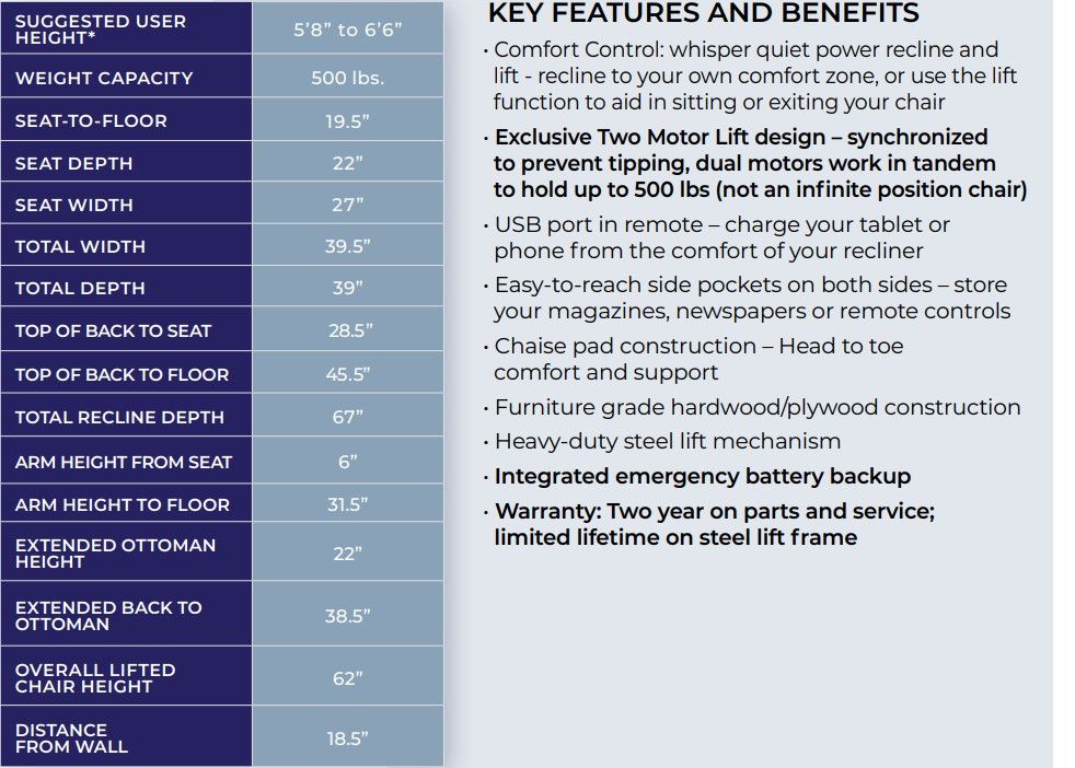 This extra-large Power Recliner™ features a 500 lb. weight capacity and a suggested user height range of 5’8” to 6’6”. Its dual-motor lift system works in tandem for stability and prevents tipping, ensuring smooth and secure operation.