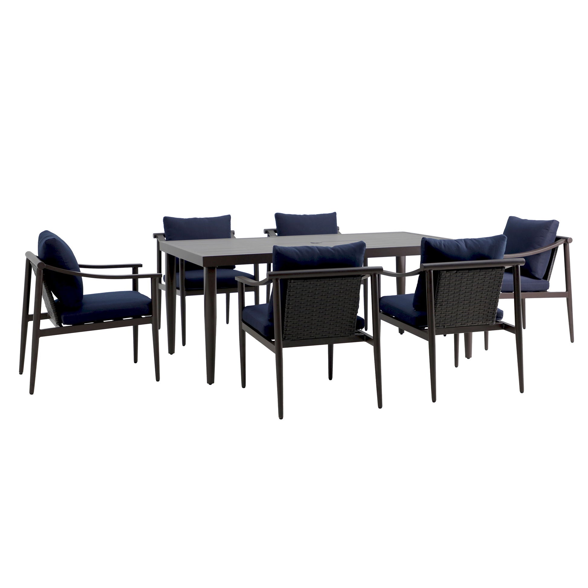 Experience outdoor dining in style with the Moana Outdoor Patio Dining Set, featuring a durable table and side chairs with comfortable blue cushions. The aluminum frames boast a baked-on powder coat finish, providing a strong foundation that resists scratches and enhances longevity. The table''s classic slatted top not only adds aesthetic appeal but also aids in water drainage, making it practical for any weather. Crafted from high-density PE wicker, the set offers the timeless look of wicker with the modern benefits of being low-maintenance, colorfast, and resistant to water, mildew, and fading. The chairs come with cushions made from our exclusive Sundura™ fabric, a solution-dyed 100% polyester that resists fading, mildew, and moisture, ensuring vibrant color season after season. High-density 6cm foam cushions provide comfortable seating, and with a generous 72-inch length, the table accommodates up to eight people, perfect for family dinners or outdoor gatherings. The minimalist design with clean lines and a sleek dark frame allows this dining set to seamlessly blend into various outdoor settings, offering a stylish and understated look for contemporary spaces.