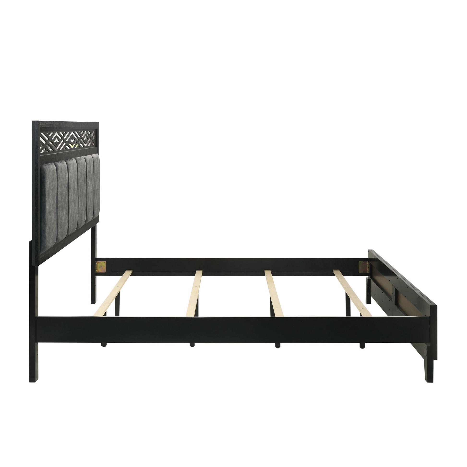 The Obsidian Panel Bed is a masterful blend of durability, style, and comfort. Crafted from premium solid Rubberwood, this bed is enhanced with manufactured woods and veneers, ensuring both lasting beauty and the robustness of genuine wood. Its sleek design is defined by clean lines and a chic, low-sheen finish that exudes bold elegance. The geometric cut-outs, backed with mirror-like Mylar, introduce a luxurious touch of modern glamour. The headboard is not just visually appealing but also supremely comfortable, featuring a plushly padded, channeled upholstery panel made from ultra-soft, easy-care 100% polyester. The subtle contrast of mottled gray fabric adds a sophisticated nuance, making this bed a perfect blend of style and comfort for any modern bedroom.