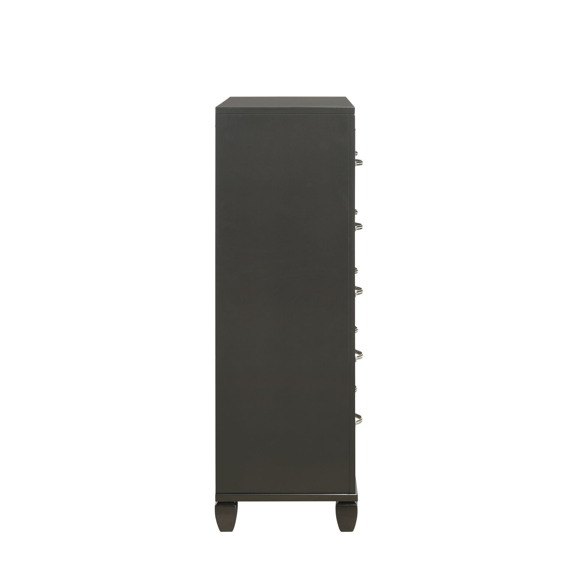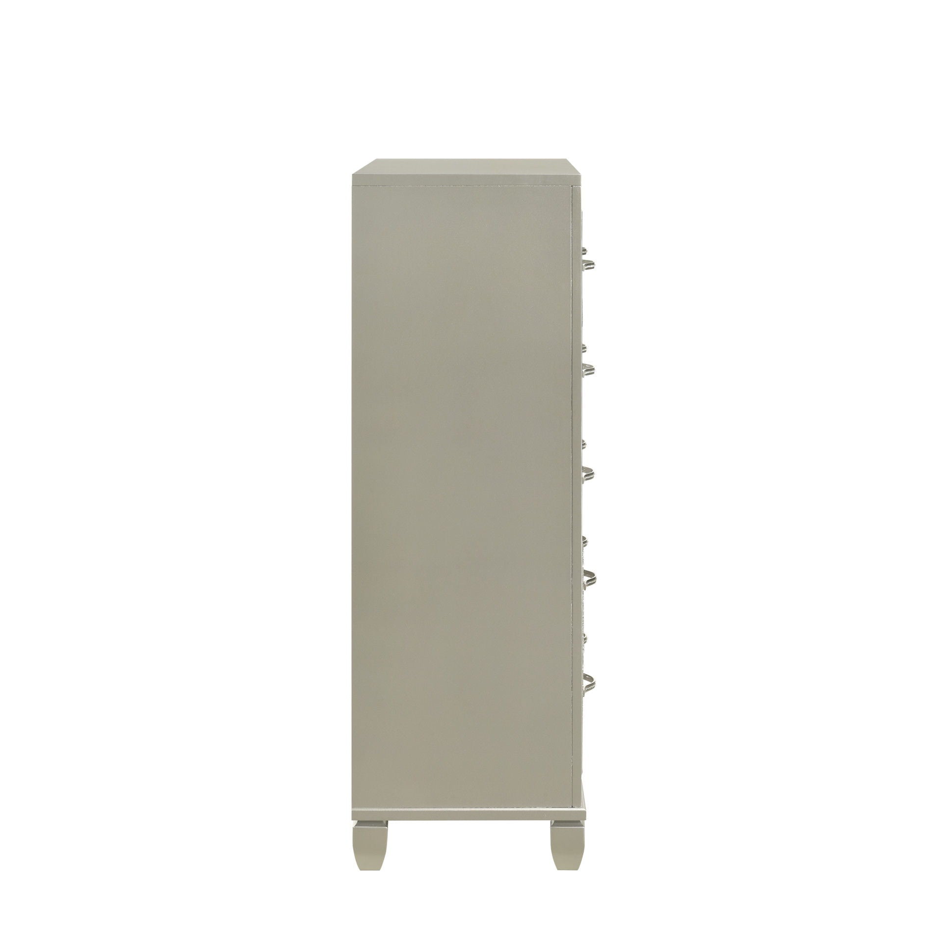 Introducing the Radiance 5 Drawer Chest, meticulously crafted for lasting stability and durability from a combination of Solid Rubberwood and manufactured woods. Its semi-gloss lacquer finish lends a silky, modern touch to this captivating collection. Glossy textured inlays and mylar trim elegantly frame the drawers, showcasing a crushed crystal decorative laminate front adorned with brushed chrome finish handles featuring inset crystal accents. With five heirloom quality English dovetail drawers equipped with full extension glides, organizing your essentials becomes effortless. The finished interiors ensure snag-free storage, while the felt lining in the top drawers offers added protection for delicate items like jewelry, watches, or glasses. Experience the perfect blend of functionality and glamour with the Radiance 5 Drawer Chest.