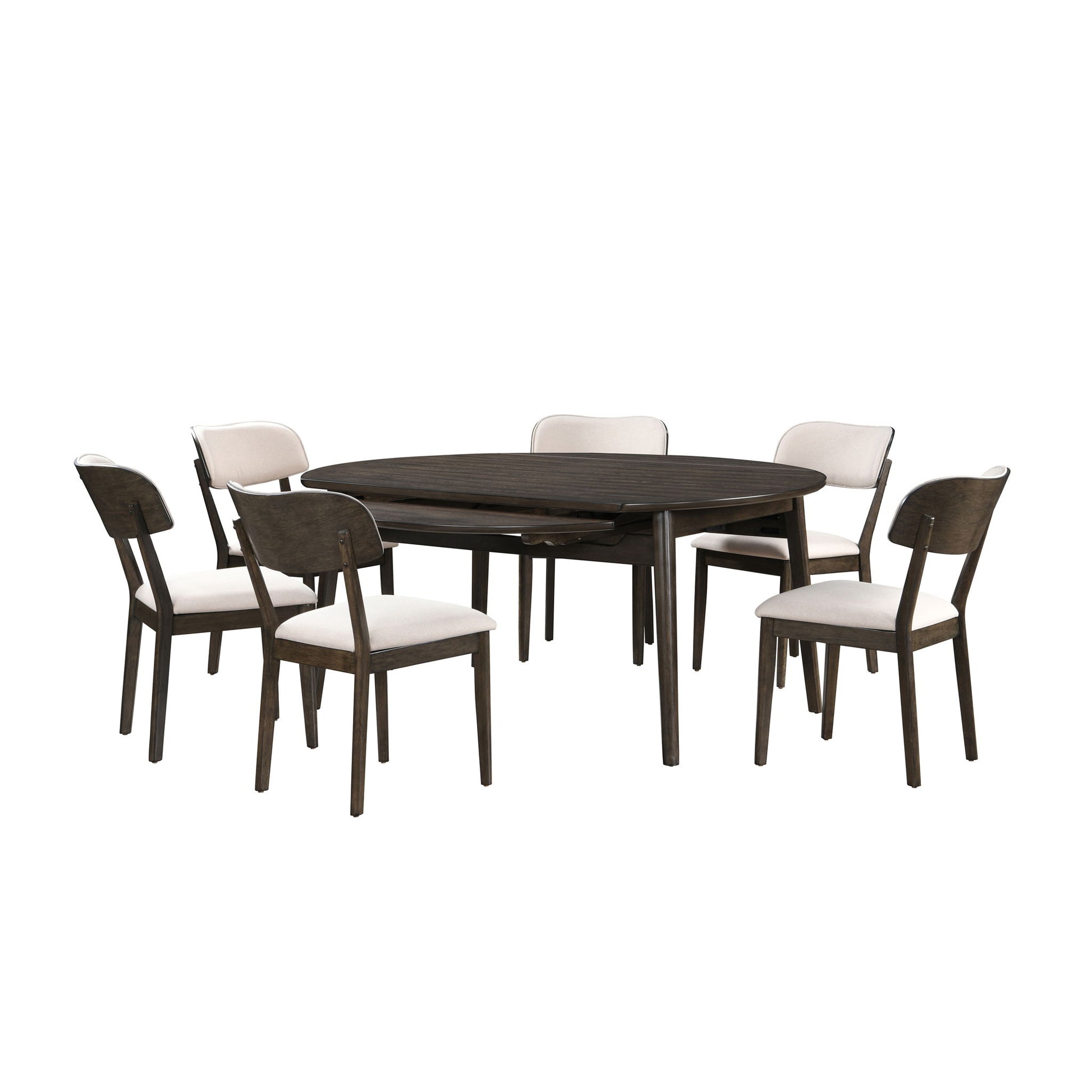 The Rex Mid-Century Modern Wood Dining Set offers a stylish and functional solution for your dining area. This set includes a 65" round dining table with self-storing leaves and chairs. Crafted from solid rubberwood, manufactured woods, and oak veneers, it ensures exceptional stability and longevity. The classic mid-century modern design features a minimalist aesthetic with clean lines, rounded edges, and angled, tapered legs, capturing the timeless elegance of the era. The multi-step finish, hand-rubbed with a clear topcoat, enhances the natural beauty of the wood grain. The chairs provide comfortable seating with softly rounded backrests and resilient foam seat cushions wrapped in 100% easy-care polyester fabric. The innovative round dining table extends with self-storing leaves to provide seating for six, making it perfect for both everyday meals and special occasions. This dining set combines quality construction, classic design, and practical functionality, making it a great addition to any home.