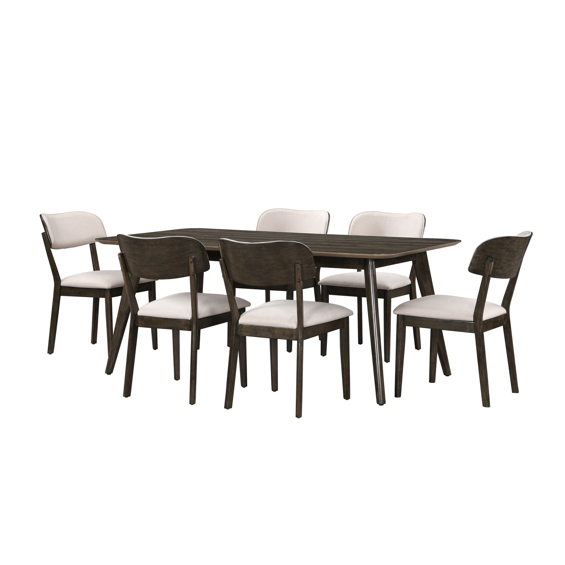 The Piece Mid-Century Modern Wood Dining Set is an ideal blend of style and practicality for your dining space. This set includes a 72" rectangular dining table and chairs, all crafted from solid rubberwood, manufactured woods, and oak veneers for superior stability and longevity. The classic mid-century modern design features a minimalist aesthetic with clean lines, rounded edges, and angled, tapered legs, evoking a timeless elegance. The multi-step walnut brown finish, hand-rubbed with a clear topcoat, highlights the natural beauty of the wood grain. The chairs offer comfortable seating with softly rounded backrests and resilient foam seat cushions wrapped in 100% easy-care polyester fabric. This spacious dining table provides ample room for six, making it perfect for both everyday meals and special gatherings. Enhance your dining experience with this durable and stylish dining collection.