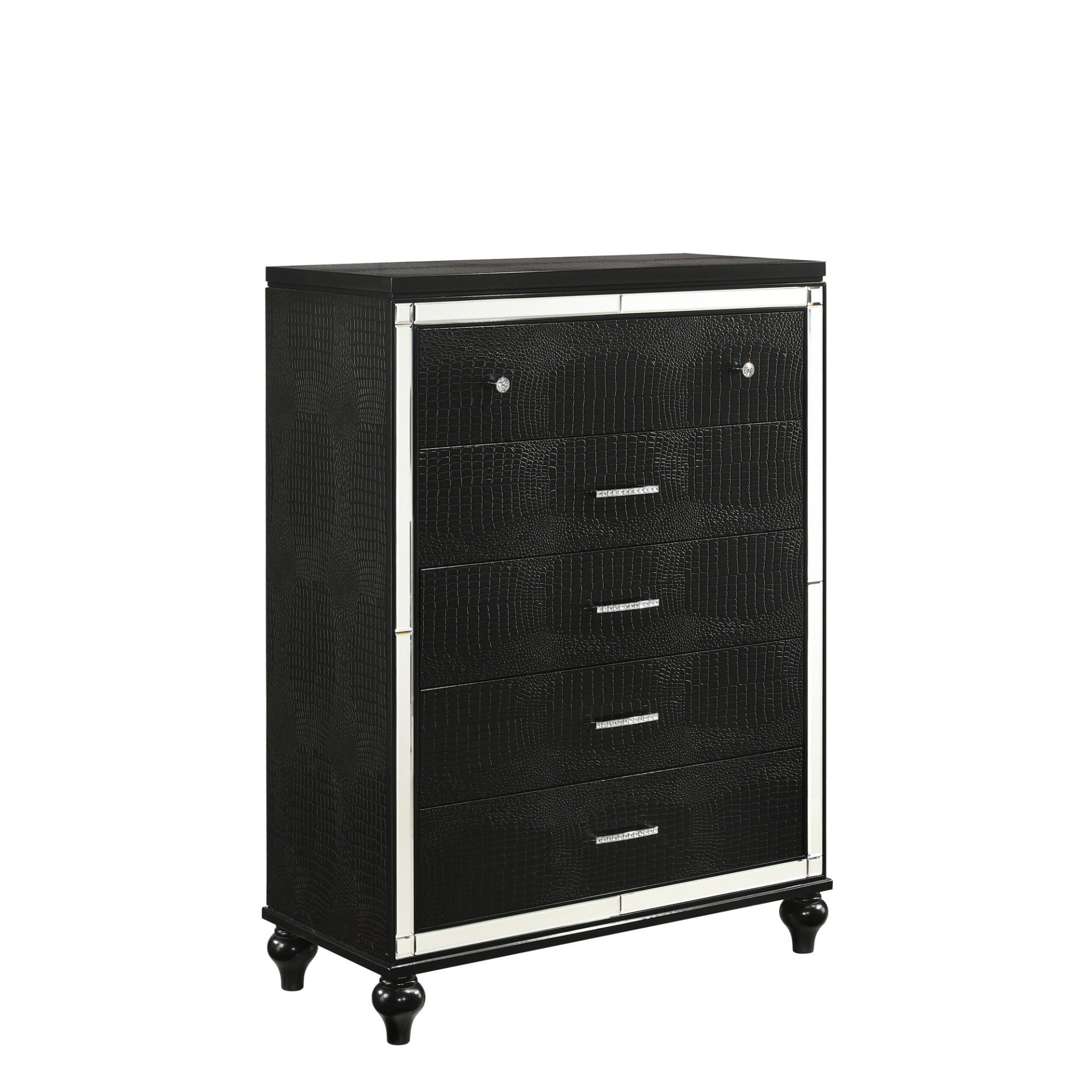 The Valentino 5 Drawer Chest is a testament to enduring craftsmanship crafted from a blend of manufactured and solid woods, adorned with exquisite embossed inlays. Radiating with glitz and glam, its gleaming finish, mirrored trims, crystal-studded drawer pulls, and alligator-embossed accents capture the essence of Hollywood allure. Delight in its thoughtful details, from heirloom-crafted English dovetailed drawers with snag-free interiors to smooth full-extension ball-bearing glides. With an abundance of storage, this chest offers ample space to organize your clothing and belongings effortlessly. Experience luxury and functionality combined in this distinctive pieceāa must-have addition to any bedroom sanctuary.